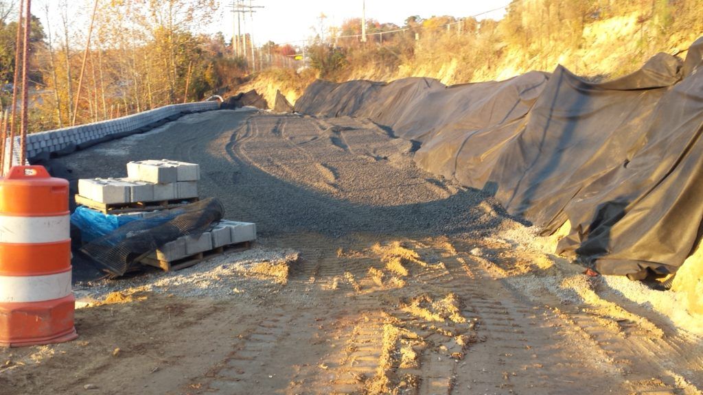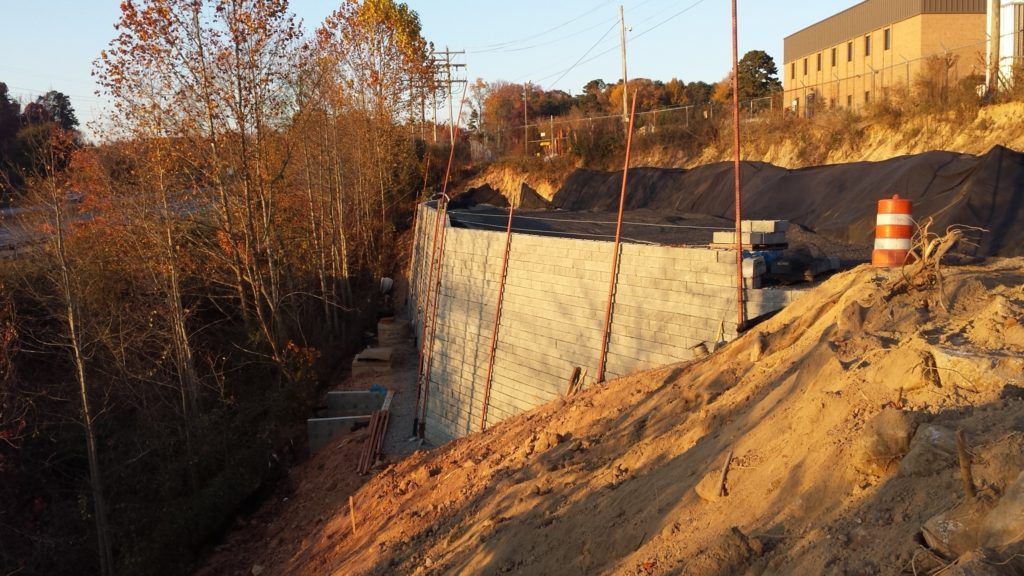 - New 40' tall x 200' long lock block retaining wall and grid that extended over 30' back into the the slope.